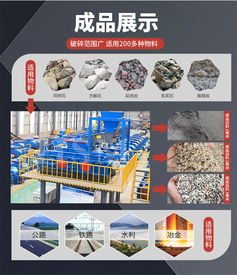 河卵石、方解石、石英、玻璃、大理石、鵝卵石、膨潤土、鐵礦石、青石、山石、石灰石、風(fēng)化砂、輝綠巖、花崗巖、玄武巖等物料的破碎制砂工作。